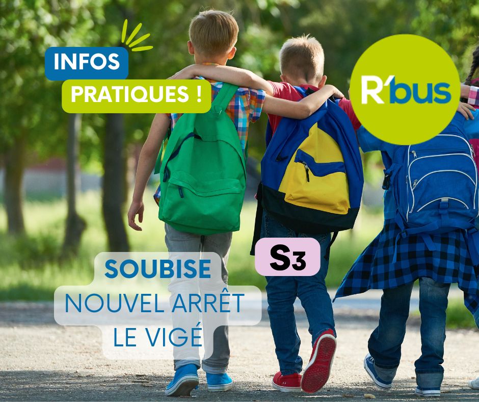 Nous vous informons que dès le lundi 20 avril, la ligne S3 du réseau R’bus desservira un nouvel arrêt : « Le Vigé » à Soubise (situé rue du Vigé, entre la rue des Vignes et la rue de la Clé des Champs). Cette évolution entraîne une modification des horaires de la ligne S3. Nous invitons les voyageurs à consulter les nouveaux…