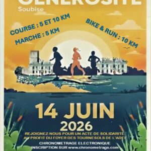 Pour sa 19e édition, la Course de la générosité revient au profit du foyer des Tournesols de l’ADEI à Soubise. Rejoignez le R’running sur l’une des 4 épreuves proposées afin de récolter des fonds pour une bonne cause ! Les courses au programme