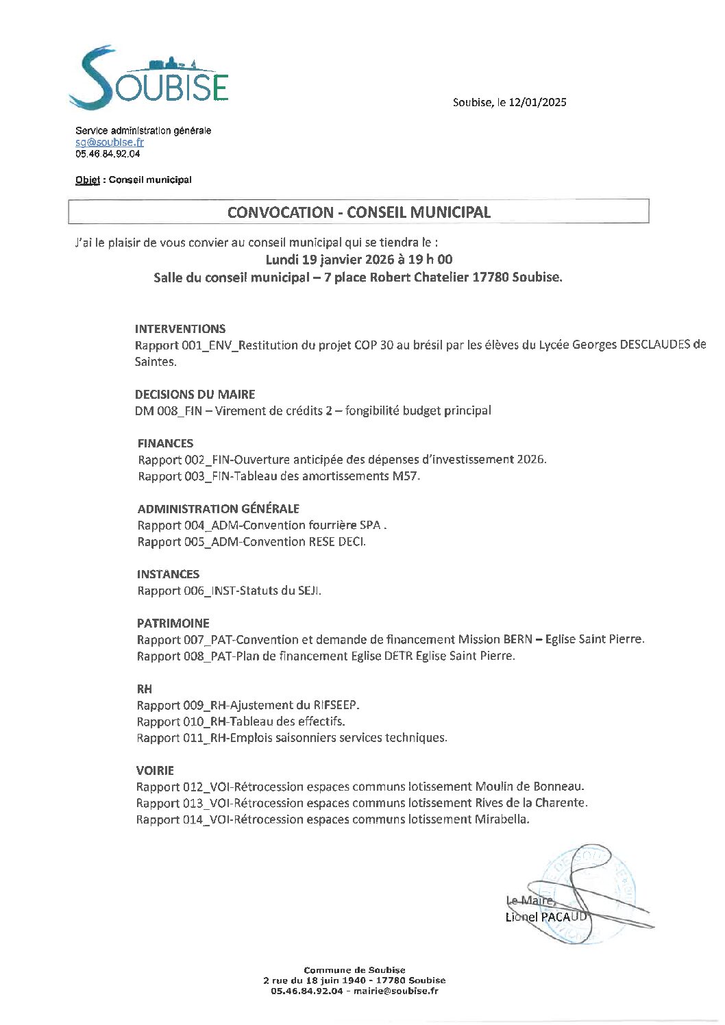 Conseil municipal 19 janvier 2026 CONVOCATION CONSEIL MUNICIPAL 19 janvier 2026 pdf | 48,28 Ko | 12 Janvier 2026 Télécharger + Ajouter à mon Agenda Google + iCal / Outlook export 00 jours 00 heures 00 minutes 00 secondes Date 19 Jan 2026 Heure 19:00 - 22:00 Lieu Salle du conseil municipal Catégorie Evènements Partagez cet événement janvier 2026 Jan 19 2026 Conseil municipal 19 janvier 2026 Salle du conseil municipal Pas d'événement actuellement programmé.